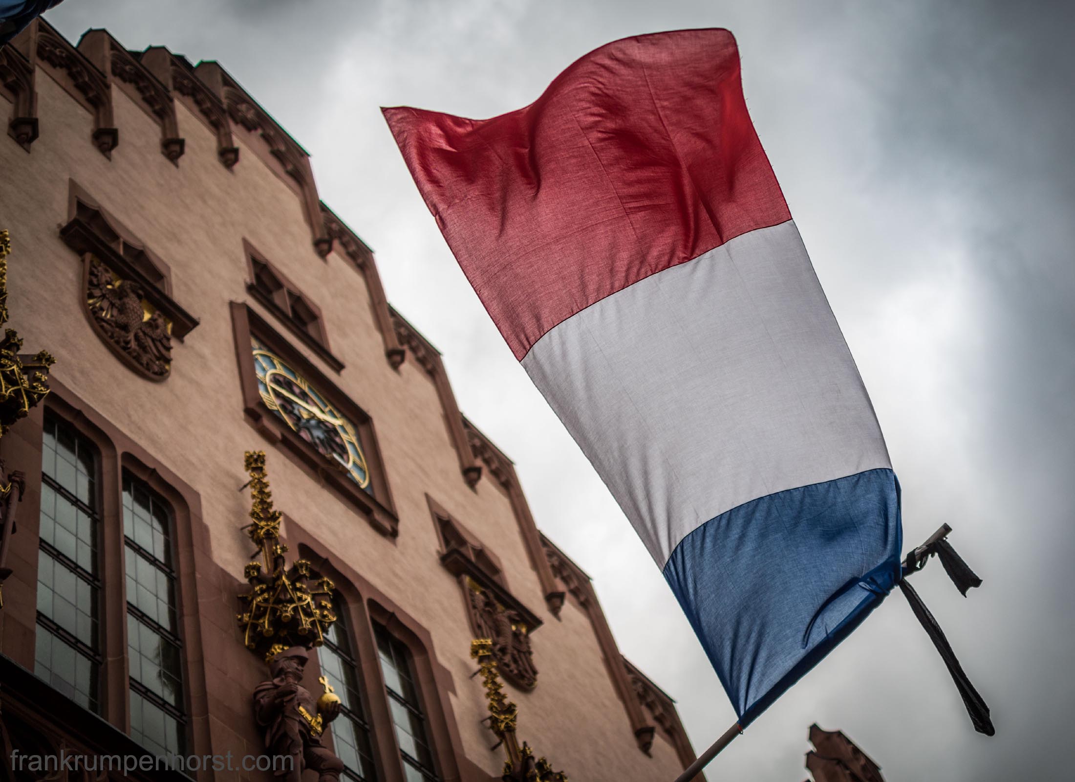 January 10, 2015 by frankrumpenhorst Tricolore and Black Ribbon The French flag and a black ribbon fly in front of Frankfurt’s old city hall as a tribute to the victims of the terrorist attack on Charlie Hebdo magazine in Paris. Related