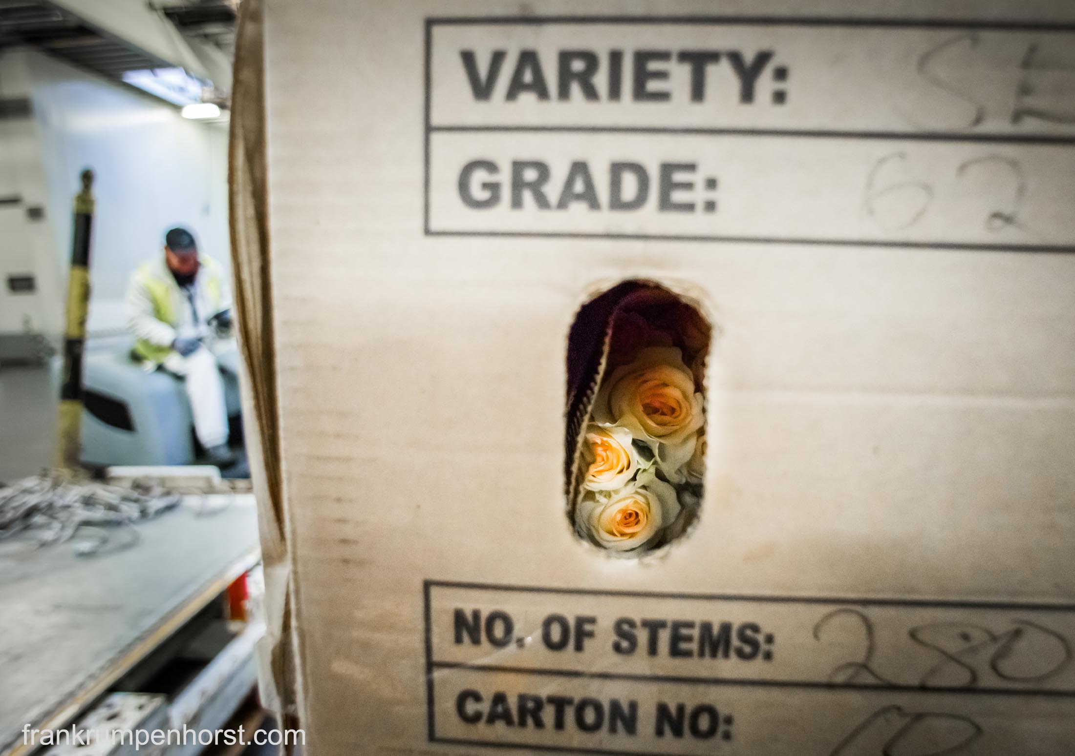 Roses in a cardboard box at Frankfurt airport after being freshly flown in from Kenya. Last year, Germany imported some 20 million roses from that African country, the peaks always being the weeks before Valentine’s Day and Mother’s Day. In 2013, Frankfurt was ranked No. 8 among the world’s major airports in cargo traffic.