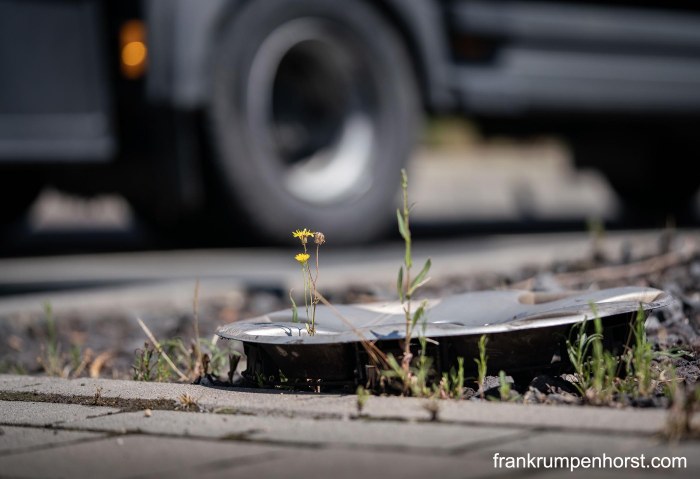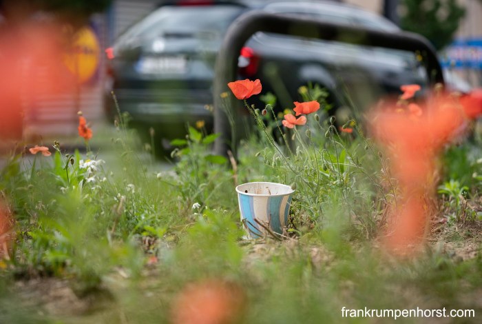 Little wild plants grow and bloom by the city streets of Frankfurt on June 29, 2020.