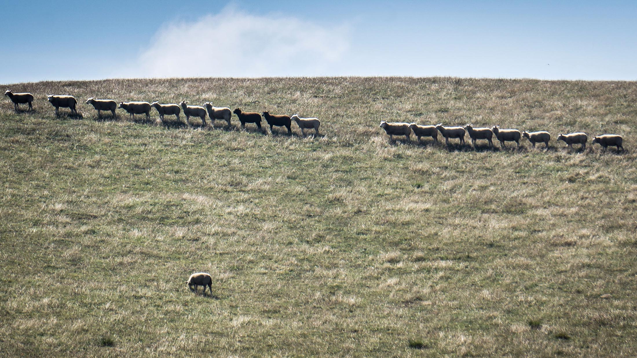 A sheep refuses to stand in the neat row on a meadow close to the Baltic Sea shore at Kaseberga in southern Sweden, Aug. 18.