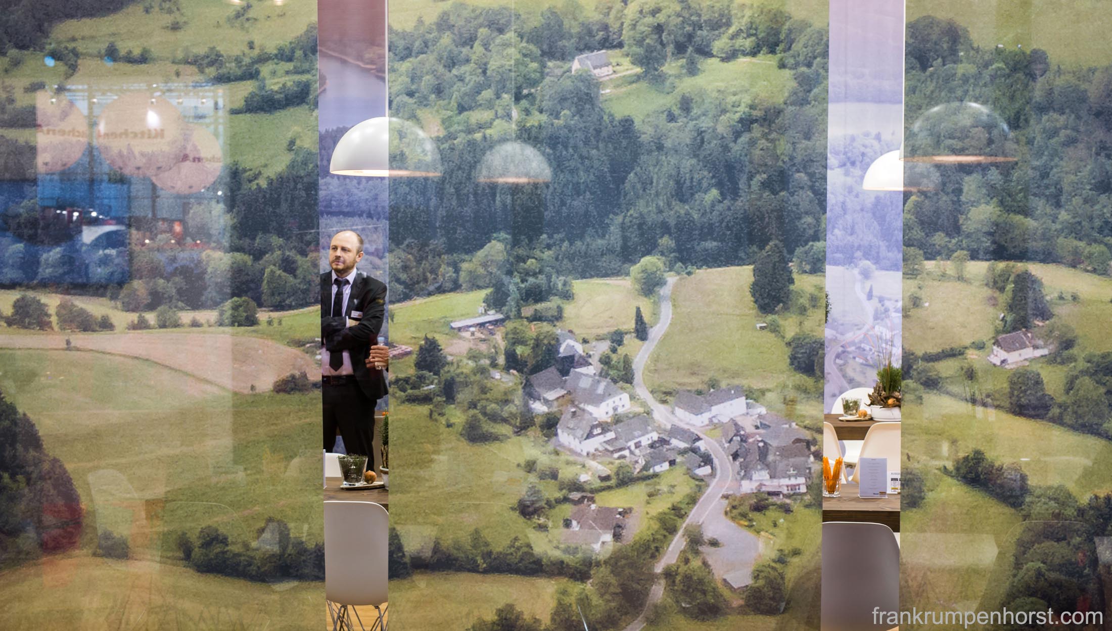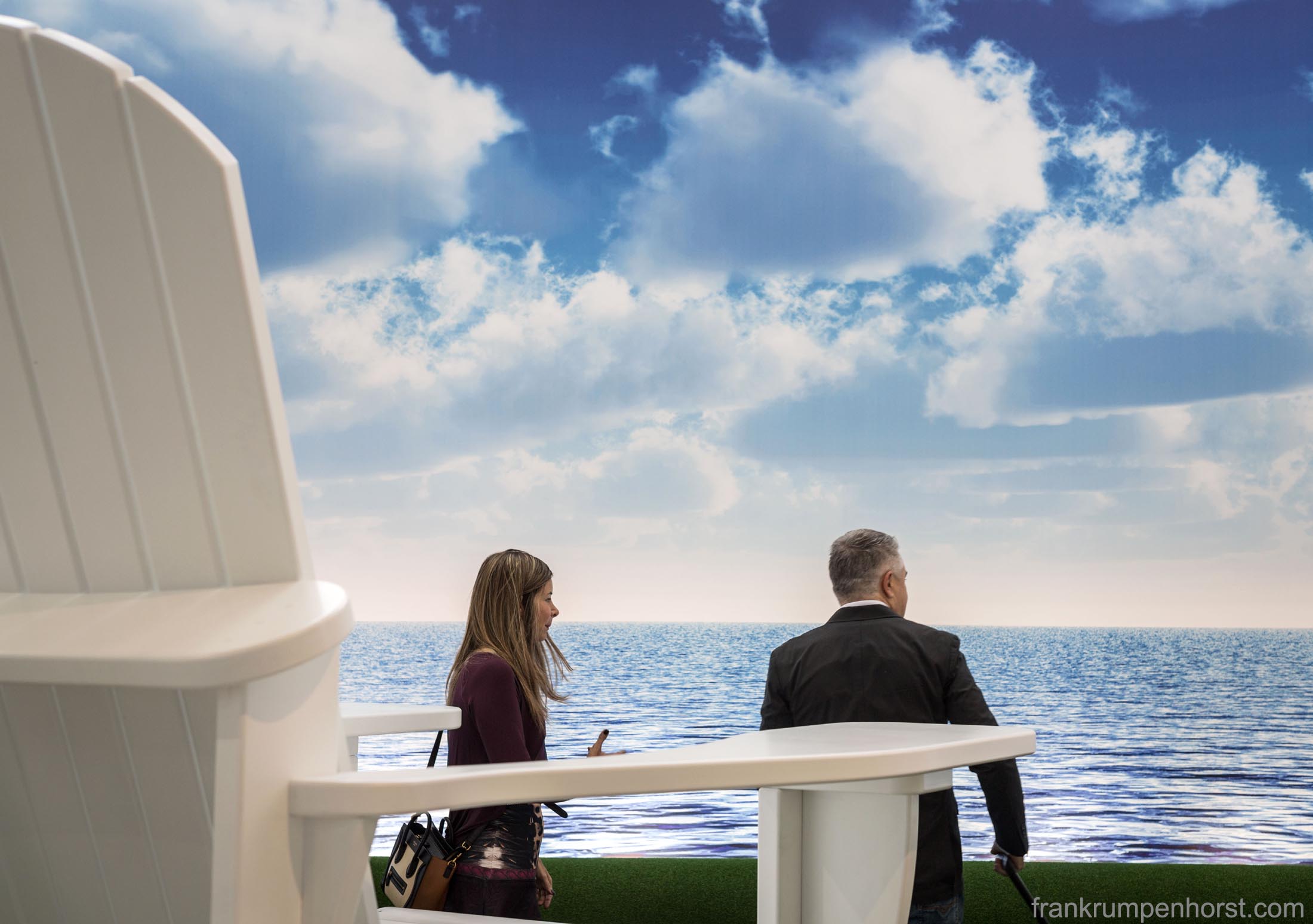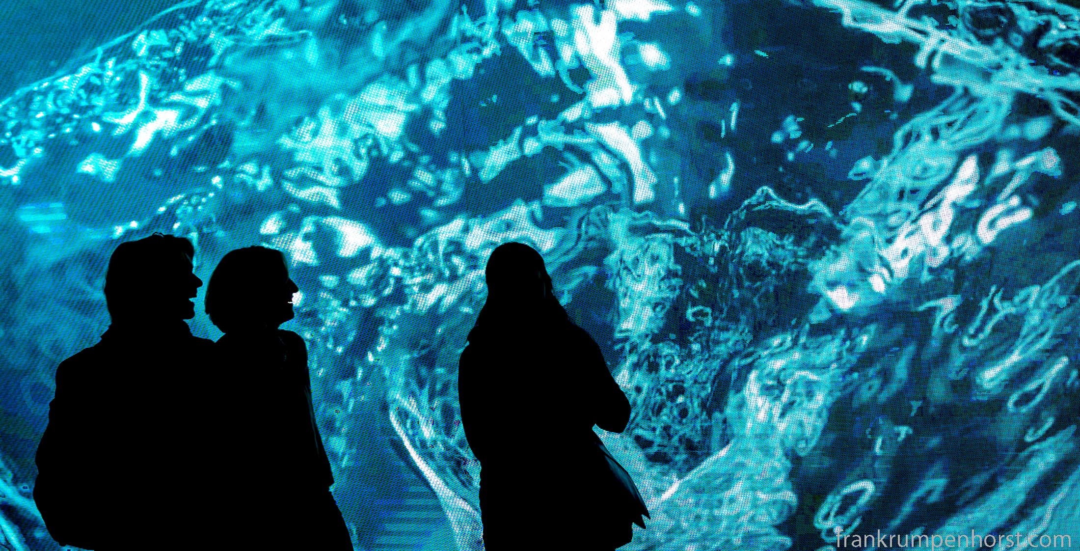 Visitors in front of a screen displaying water at the ISH trade fair in Frankfurt, March 10. The fair claims to be ‘the world’s biggest showcase for innovative bathroom design, energy efficient heating and air-conditioning technology and renewable energies’. There are also a lot of water-closets on display…